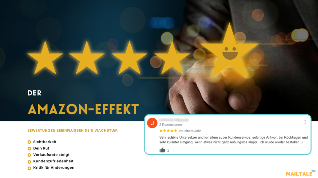 Ja, das kannst Du. Wir empfehlen jedoch, bei der Bitte um Bewertungen nicht zu aufdringlich zu sein. Mit Mailtale kannst Du automatisch eine Erinnerungs-E-Mail mit einer anpassbaren Verzögerung senden, falls Kunden nicht auf Deine erste Kontaktaufnahme reagieren.